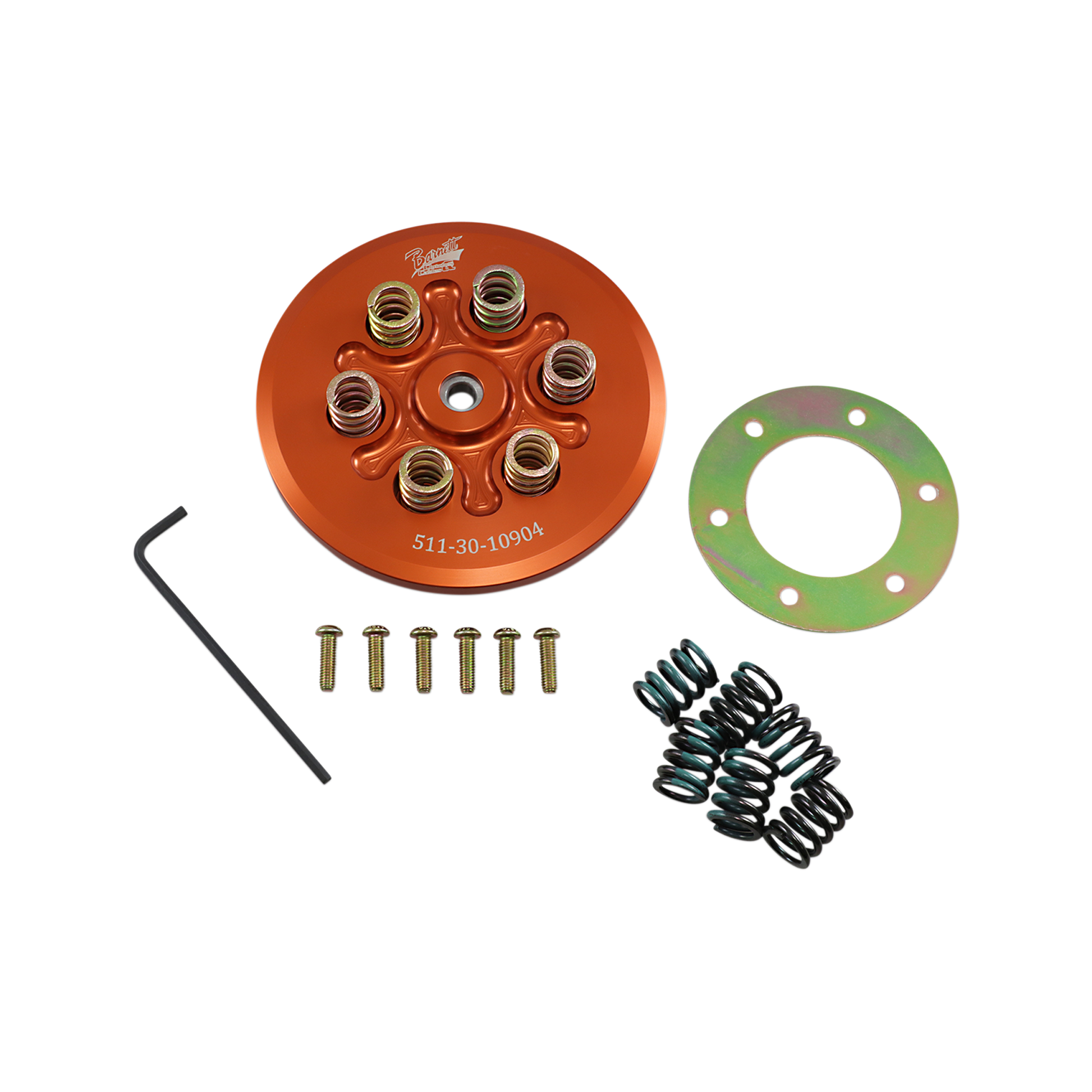 Fits Harley Big Twin Cam models with hydraulic clutch. Converts stock diaphragm spring to six coil springs. Provides a more progressive, controllable engagement. Includes a billet aluminum pressure plate and two sets of heavy duty coil springs providing three spring pressure options. Replaces stock pressure plate/spring. Ideal for stock to heavy duty applications. Note: Does not fit 2013-2017 narrow primary models.